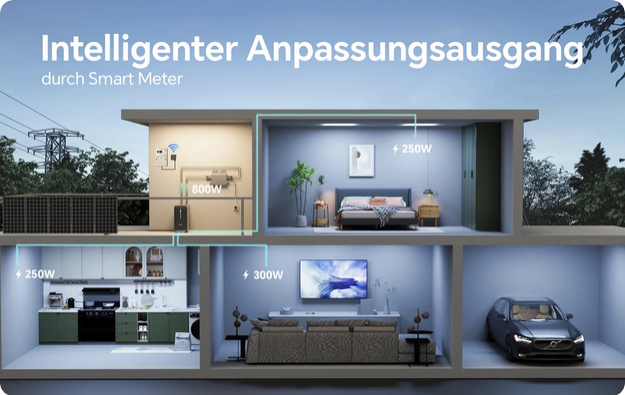 Der von den Solarmodulen erzeugte Strom fließt durch den B2500-D zum Mikro-Wechselrichter, um Ihre Haushaltsverbraucher mit Strom zu versorgen. So können Sie Ihre Abhängigkeit vom öffentlichen Stromnetz verringern und Ihre Stromrechnung senken. In Verbindung mit einem Smart Meter wird überschüssige Solarenergie auf intelligente Weise in den Speicher geladen, sodass keine Einspeisung erfolgt.